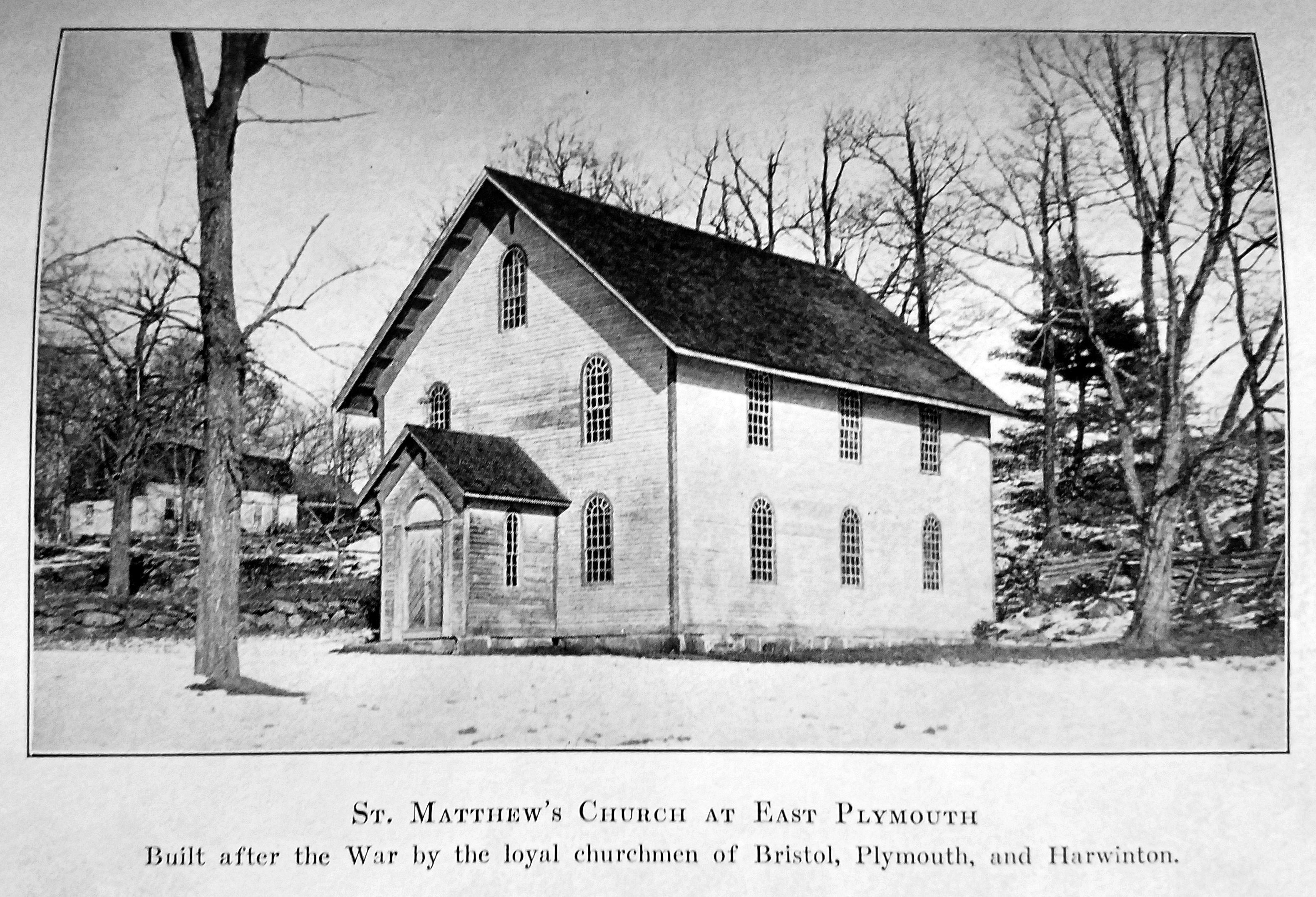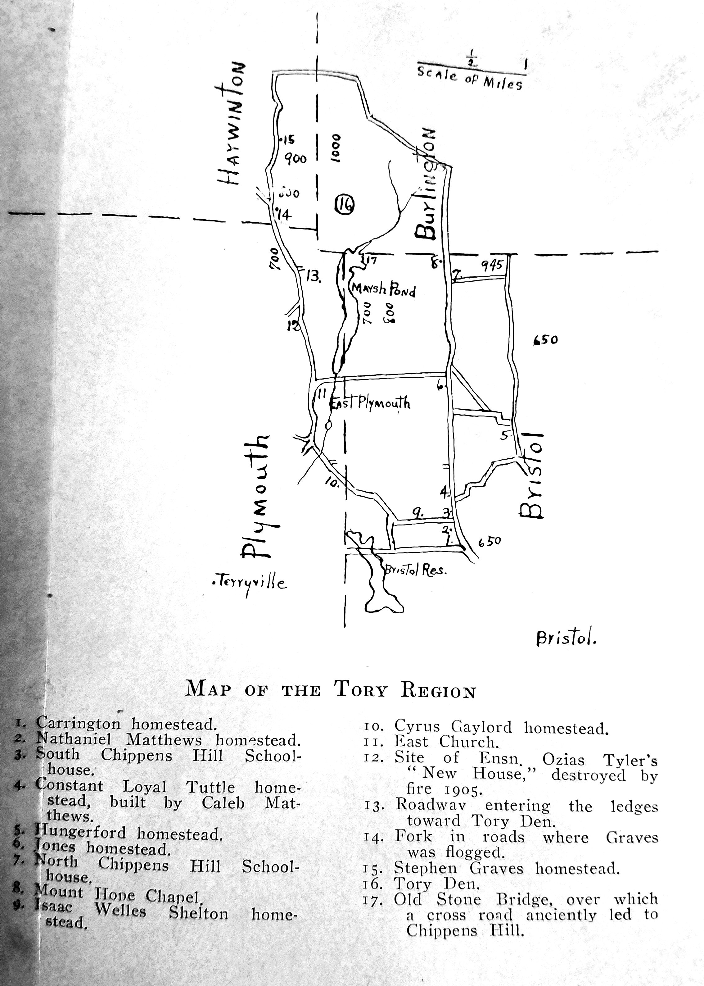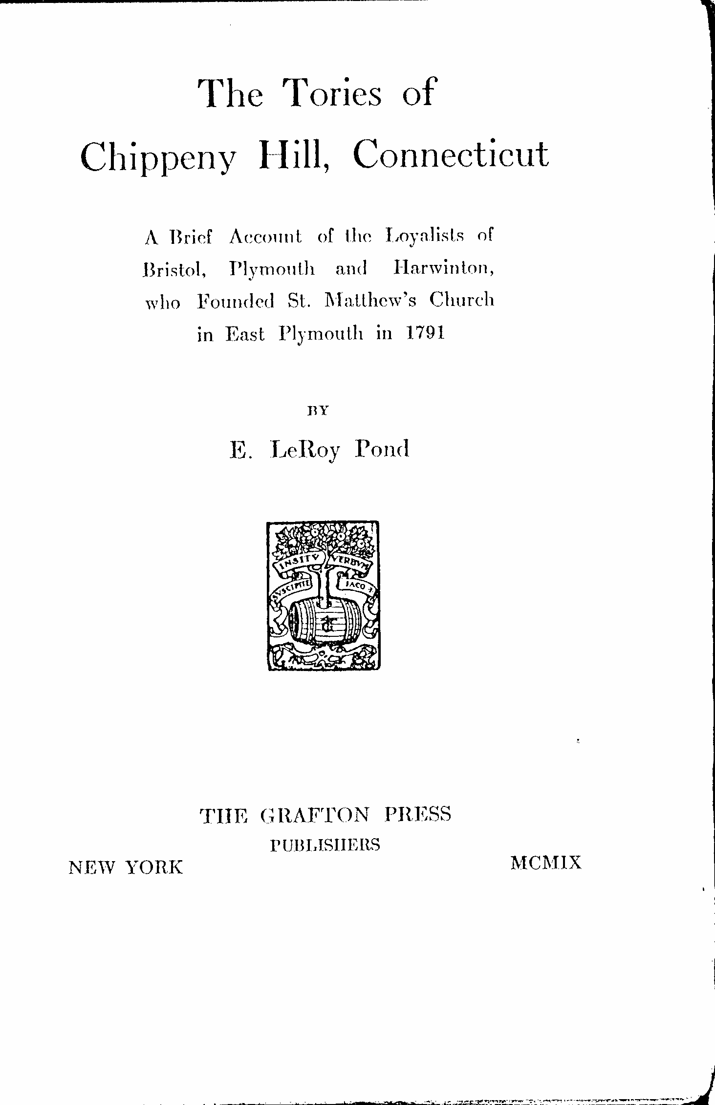 THE hamlet of East Plymouth, two miles north of Terryville, Connecticut, and more commonly known as "East Church," was brought into existence about 1792, by the building of St. Matthew's Episcopal Church by a clan of Tories. These Tories, or, if you so prefer, loyal members of the Church of England-for they could not conscientiously be loyal to the head of the church without bearing the name of Tory-lived in the farmhouses scattered along the hillsides where the boundaries of the present towns of Bristol, Plymouth and Harwinton now meet. With Chippeny Hill in the town of Bristol, or Chippin's Hill as it is commonly called now, as a centre, they had gathered together, unshaken by the stress of the times as the stone ledges north of them, united by family bonds, and by the persecutions of marauding Sons of Liberty, under the leadership of that "designing church clergyman," the Rev. James Nichols. It is certainly time that some memorial of their lives is placed upon paper. Their loyalty to their beliefs, though perhaps not guided by prudence, is certainly to be admired, and that they were hunted, robbed, flogged, and driven to the ledges for refuge, because of this loyalty, deserves not to be forgotten. They were noble men, some of them, and courageous, yet there remains little to remember them by save here and there a family tradition. In this attempt to weld together a collection of facts directly and indirectly concerning the life of that Tory clan, the writer is greatly indebted to the research and assistance of Rev. X. A. Welton, of Redlands, California, who is unashamed of his Tory ancestry, and he is also indebted to Mr. James Shepard, of New Britain.